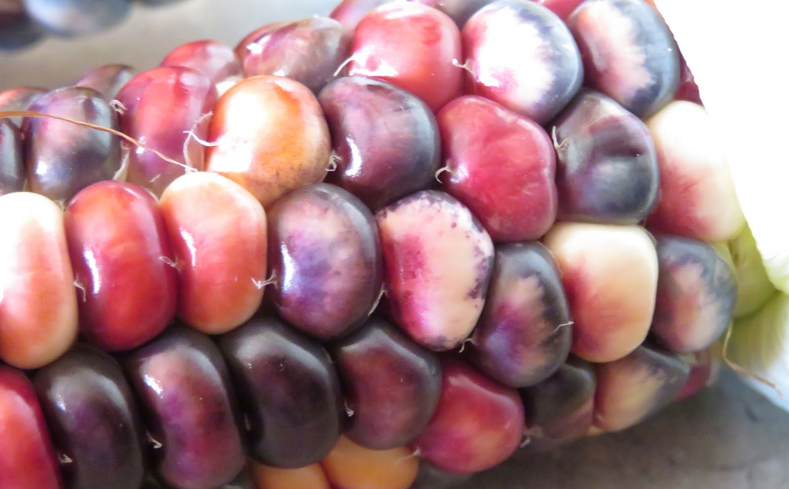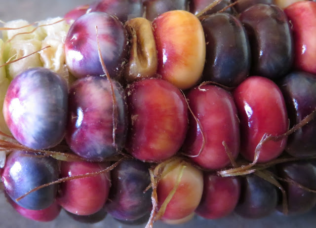 This is the second year in a row that we have planted a garden in the yard of our new house - for which we are and will ever be grateful. Last year we had some tomato plants and herbs. This year we have tomatoes, peppers, melons, cucumbers, corn, beans, squash, herbs . . . and a cabbage. I'm constantly making plans for improving, and since I'm doing a no-till approach for most of it, I've got cardboard boxes laid down over more land to expand. We have two kinds of corn growing: Painted Mountain and Hopi Blue. I timed their planting so they wouldn't cross-pollinate, and it worked: the Painted Mountain, which I planted in April, came up in the beginning of May, and its ears are ripening as the Hopi Blue is just starting to pollinate. This evening I picked the first two ears of the Painted Mountain corn, and here are some pictures.